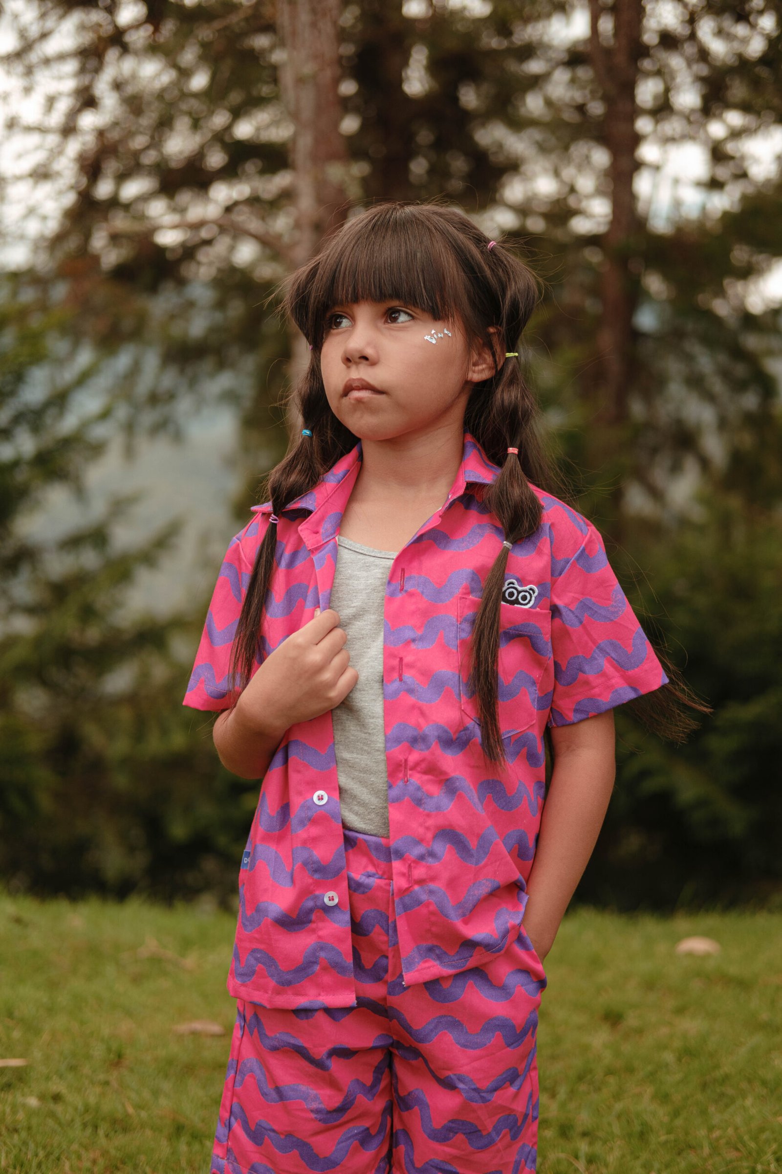 Una camisa vibrante y atrevida, llena de ondas en tonos rosa y morado que crean un look explosivo, divertido y lleno de personalidad. Perfecta para pequeños mundos que aman el color y la libertad de expresarse con estilo.
