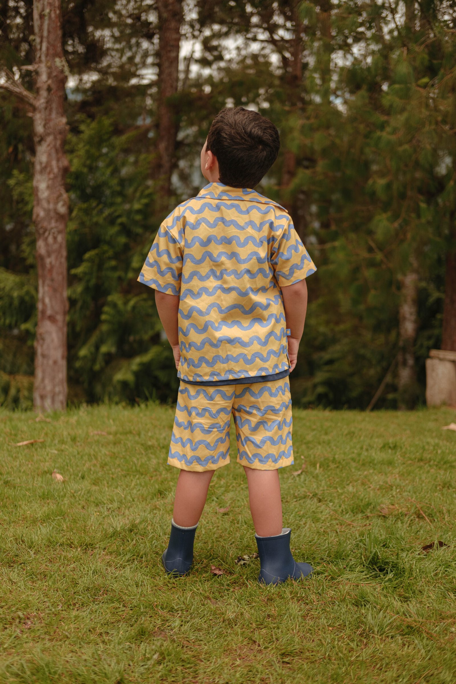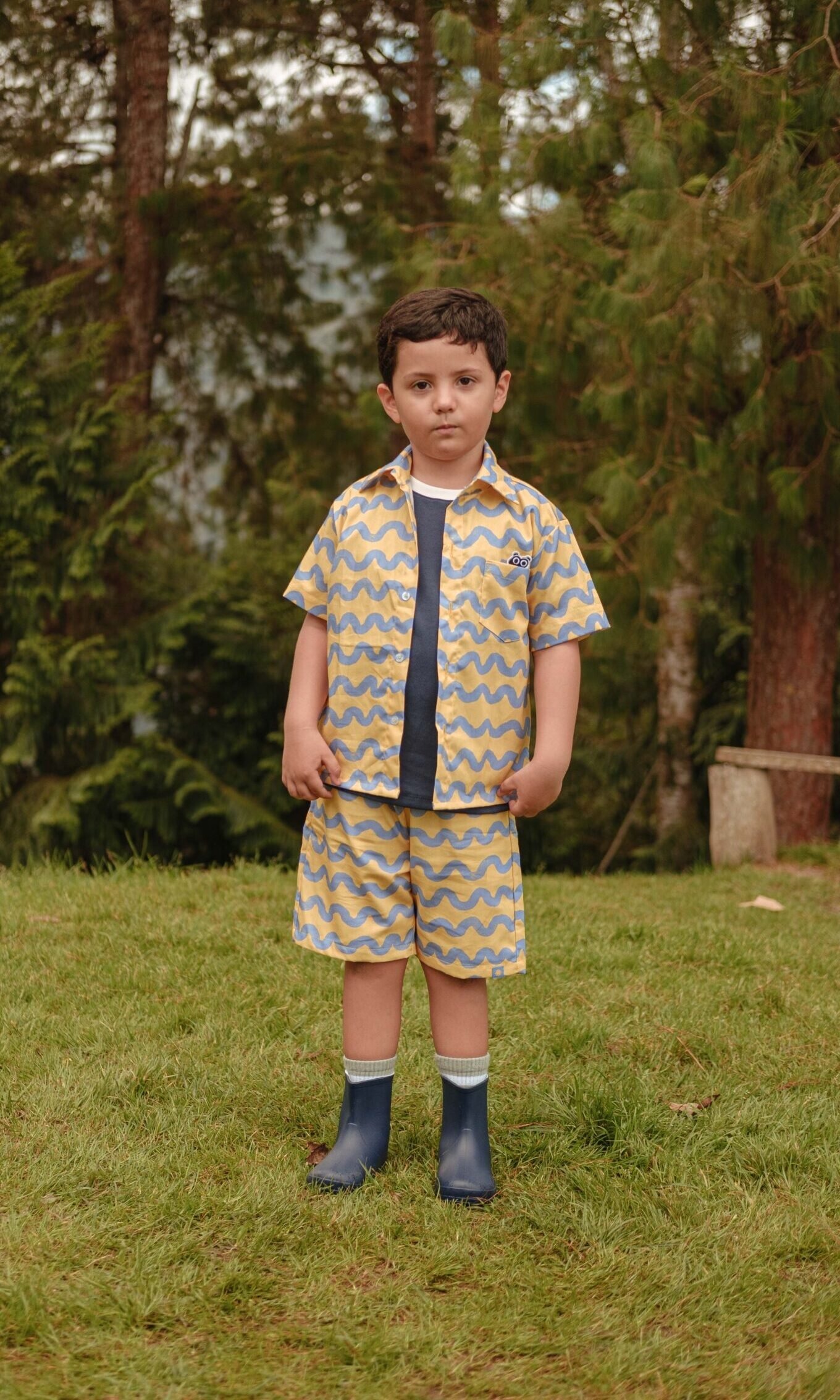Short unisex en algodón twill con estampado de ondas en tonos azul y amarillo. Su textura ligera y su ajuste cómodo lo hacen perfecto para combinar con cualquier básica y crear un look street divertido y fresco.